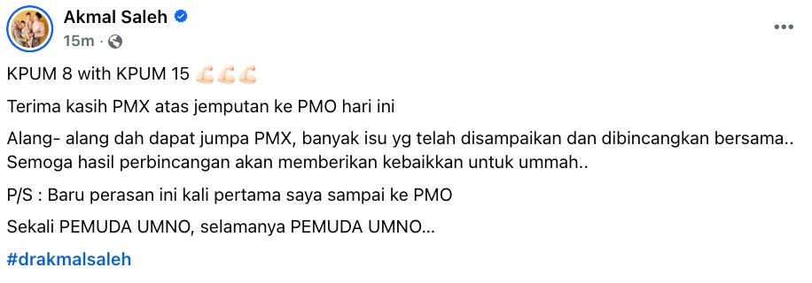 Ketua Pemuda UMNO, Datuk Dr Akmal Saleh berkongsi satu hantaran di media sosial memperlihatkan pertemuan beliau dengan Perdana Menteri Malaysia, Datuk Seri Anwar Ibrahim.