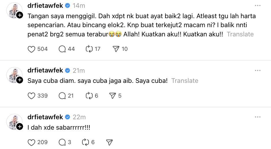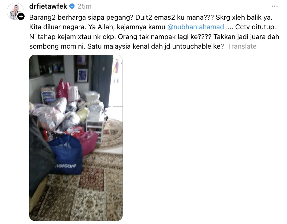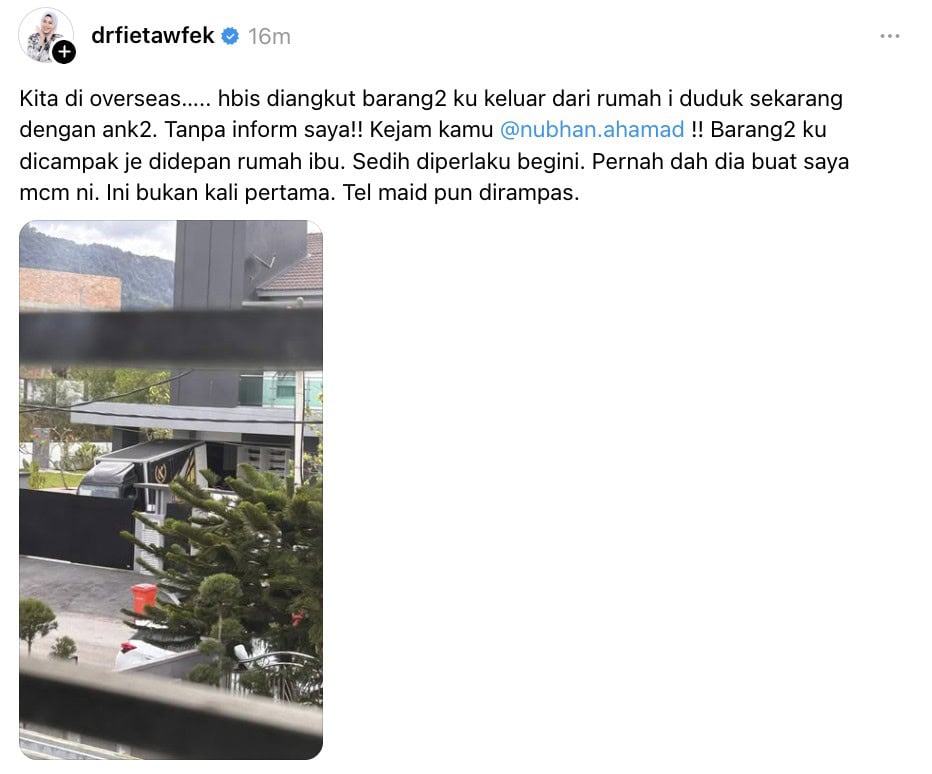 Menerusi hantaran Dr Fie di platform Threads, dia memaklumkan bahawa Nubhan telah mengeluarkan barang-barang miliknya dari rumah yang ditempati bersama anak-anak tanpa pengetahuannya memandangkan sedang berada di luar negara.