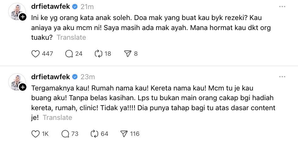 “Lepas tu bukan main orang cakap bagi hadiah kereta, rumah dan klinik! Tidak ya! Dia punya tahap bagi tu atas dasar konten je,” dedah Dr Fie.