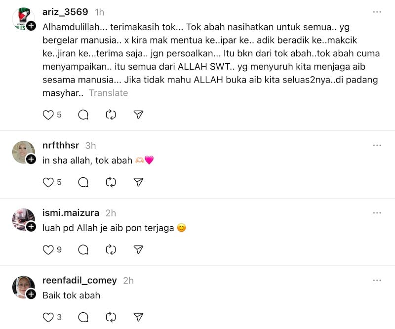 Dalam pada itu, nasihat tersebut mendapat perhatian warganet yang menyokong pandangan beliau agar setiap pasangan lebih matang dan berhikmah dalam menangani konflik rumah tangga, tanpa perlu dikongsikan kepada umum.