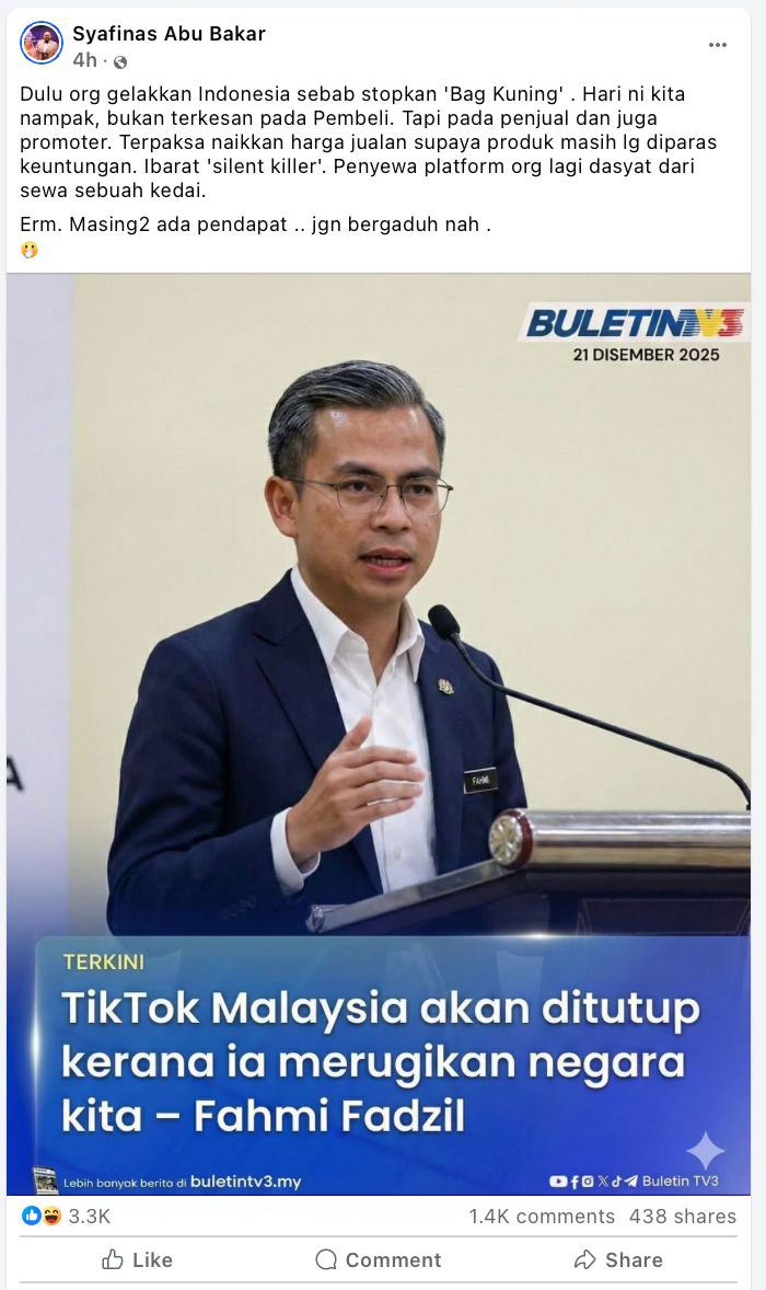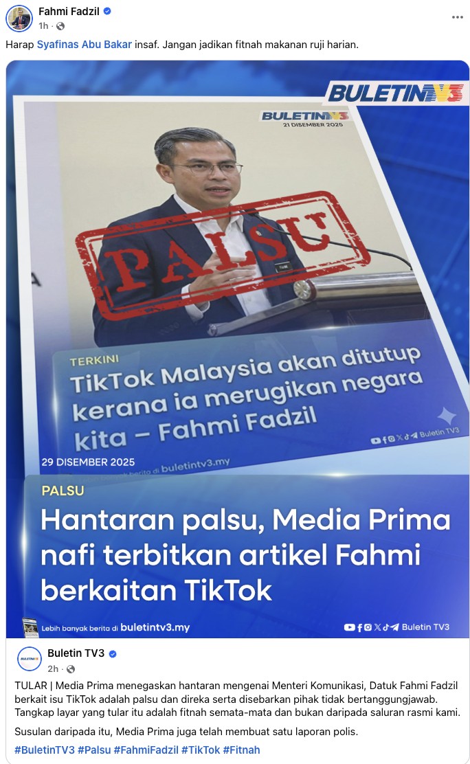Perkara tersebut dinyatakan susulan penafian Buletin TV3 berhubung dakwaan Fahmi TikTok Malaysia bakal ditutup kerana merugikan negara.