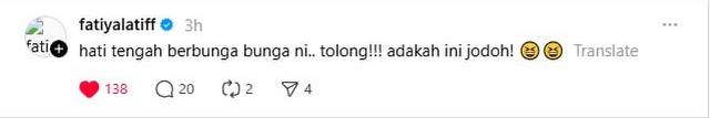 “Hati tengah berbunga bunga ni, tolong! Adakah ini jodoh?,” kata Fathia, hari ini.