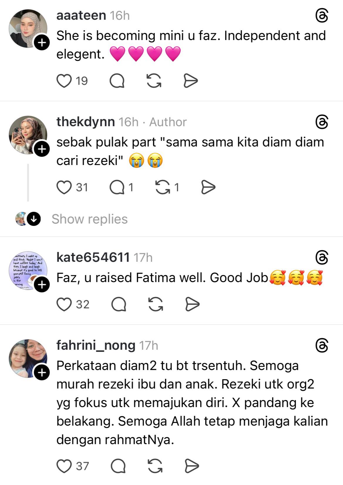 Meninjau ke ruangan komen, warganet sebak melihat pengorbanan yang dilakukan oleh Fazura dalam membesarkan anaknya dan mendoakan agar Fatima menjadi anak yang solehah.