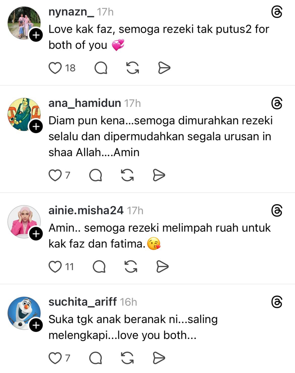 Malah ada juga wargamaya yang memuji cara pelakon itu dalam mendidik anak dan mendoakan agar rezeki mereka melimpah ruah.
