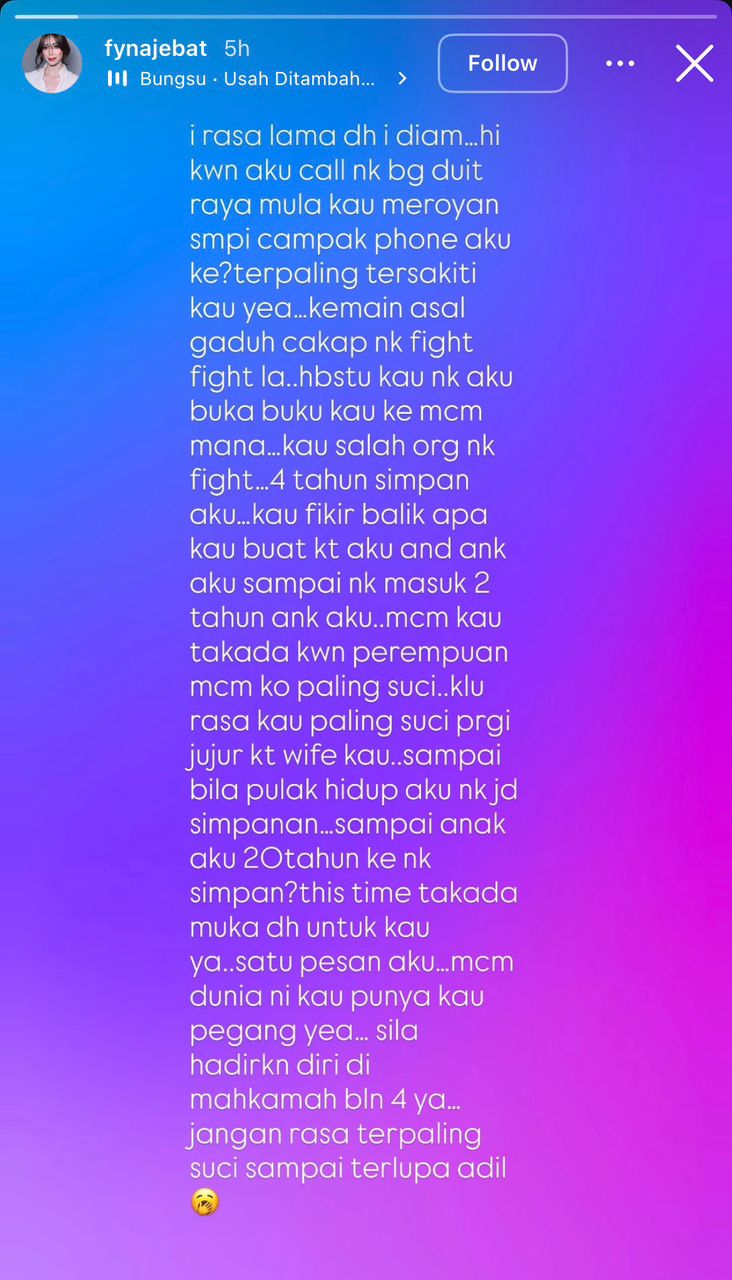 “Sampai anak aku 20 tahun ke nak simpan? Kali ini tiada muka dah untuk kau ya. Sila hadirkan diri di mahkamah bulan empat ya. Jangan rasa terpaling suci sampai terlupa adil,” ujarnya.