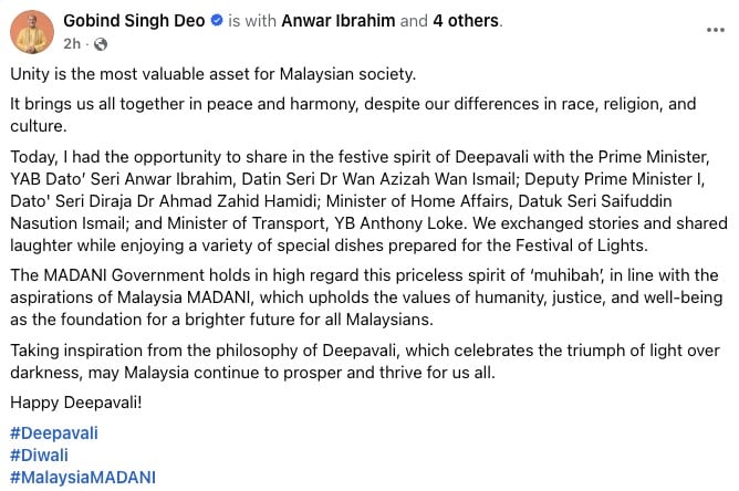 “Hari ini saya berpeluang berkongsi semangat perayaan Deepavali bersama Perdana Menteri, Datuk Seri Anwar Ibrahim dan isteri beliau Datin Seri Dr Wan Azizah Wan Ismail; Timbalan Perdana Menteri, Datuk Seri Dr Ahmad Zahid Hamidi; Menteri Dalam Negeri, Datuk Seri Saifuddin Nasution Ismail; dan Menteri Pengangkutan, Anthony Loke Siew Fook,”