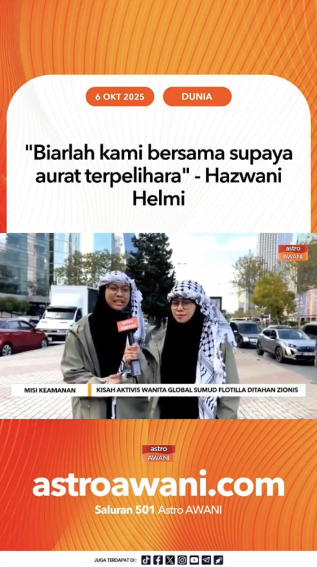 Dalam satu temu bual eksklusif bersama Astro Awani di Istanbul, Turkiye, Hazwani menceritakan bagaimana mereka melalui detik mencemaskan sebelum dan selepas kapal mereka dipintas pihak tentera di perairan Gaza.