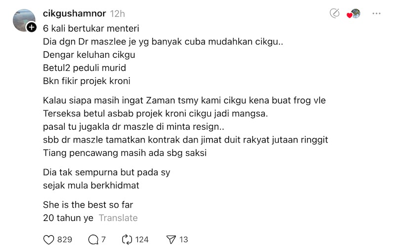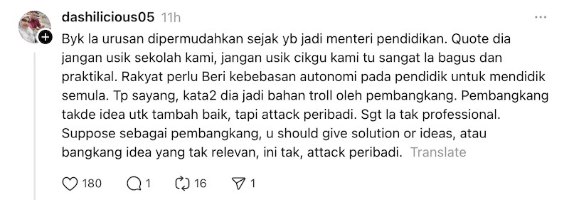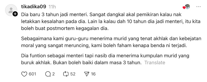 “Lain lah kalau dah 10 tahun dia jadi menteri, itu kita boleh buat postmortem atas kegagalan beliau,” ujar guru yang dikenali sebagai Tika.