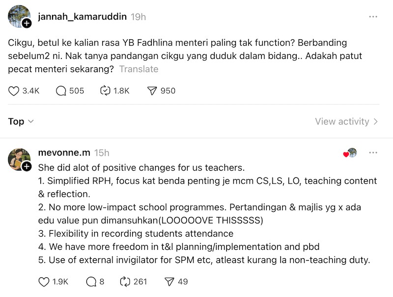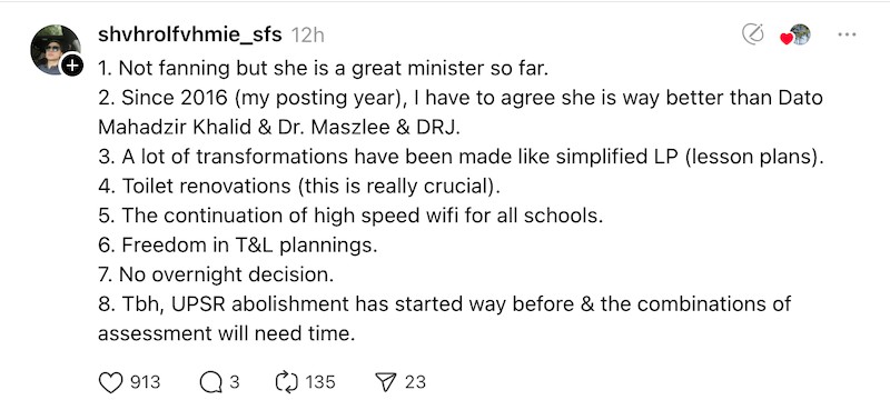 Dalam hantaran pengguna lain pula yang dikenali sebagai Jannah, ramai guru turut menyuarakan pandangan positif terhadap kepimpinan Fadhlina.