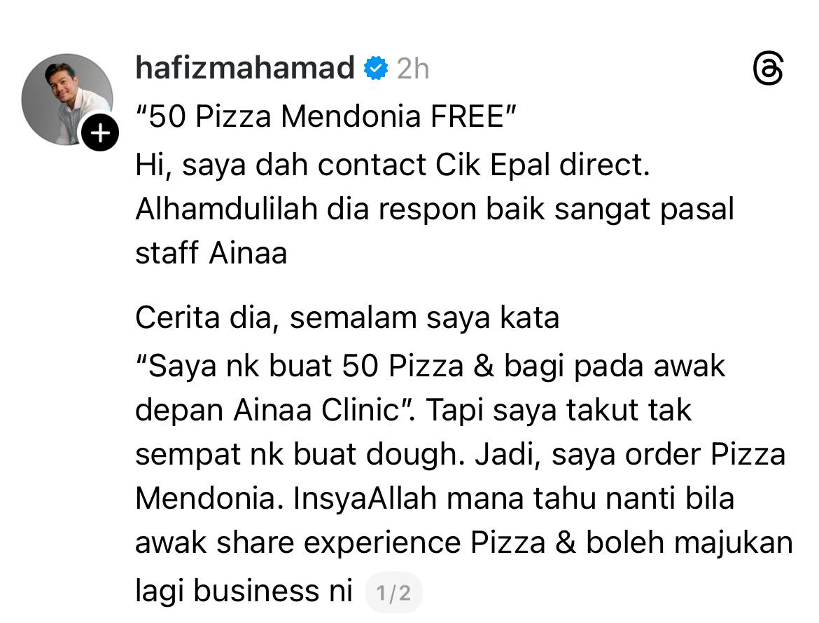 “Insya-Allah mana tahu nanti bila awak kongsi pengalaman menikmati piza ini boleh majukan lagi perniagaan Cik Epal,” ciapan Hafiz di Threads.