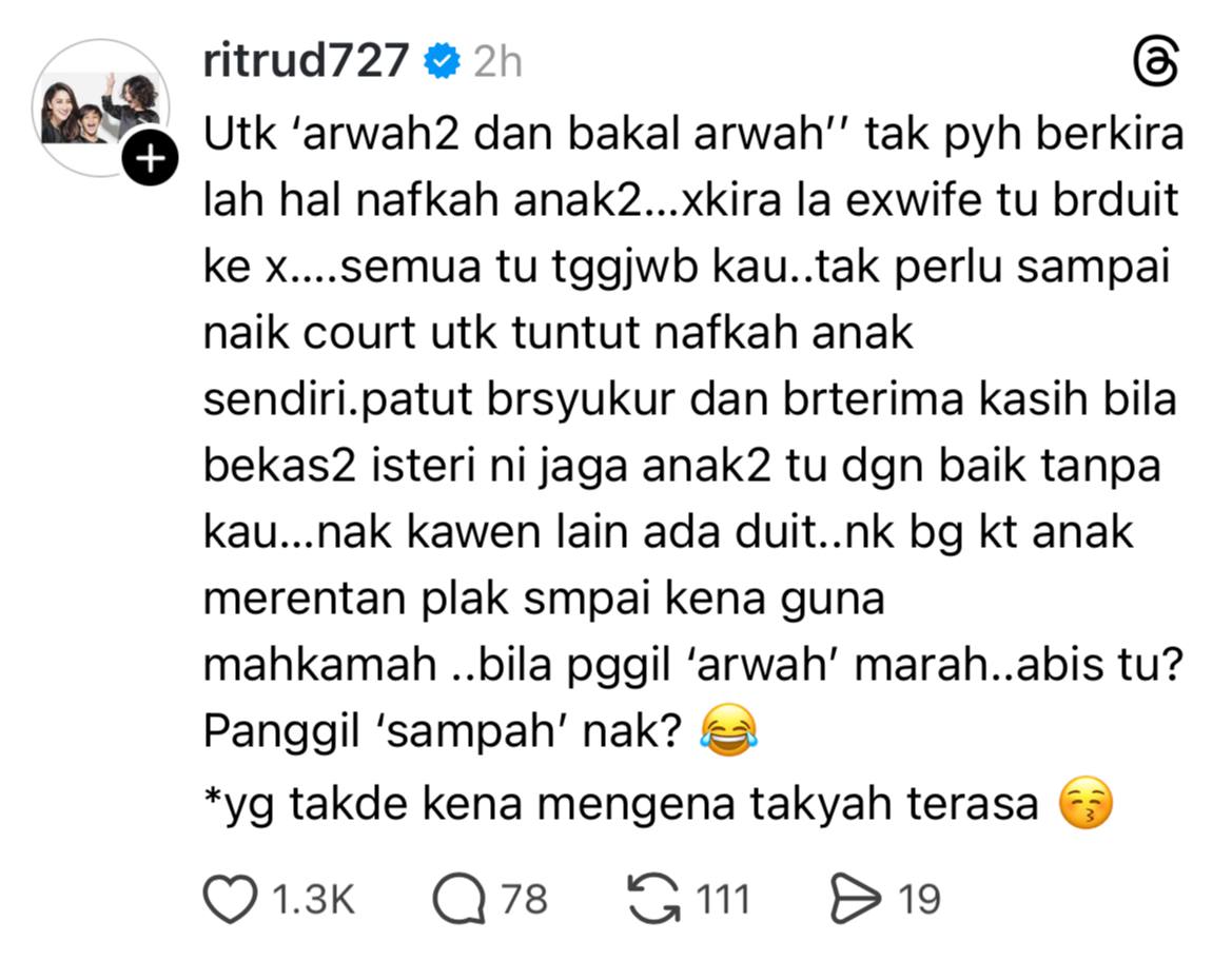 “Tak perlu sampai naik mahkamah untuk tuntut nafkah anak sendiri patut brsyukur dan berterima kasih bila bekas isteri ni jaga anak tu dengan baik tanpa kau,” kata Rita, hari ini.