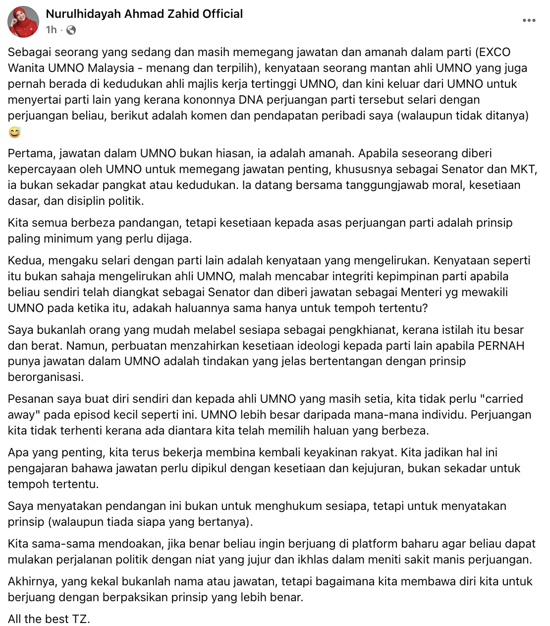 Mengulas lanjut, Nurulhidayah menegaskan jawatan dalam UMNO bukan sekadar simbol atau hiasan, sebaliknya satu amanah yang datang bersama tanggungjawab moral, kesetiaan dan disiplin politik.