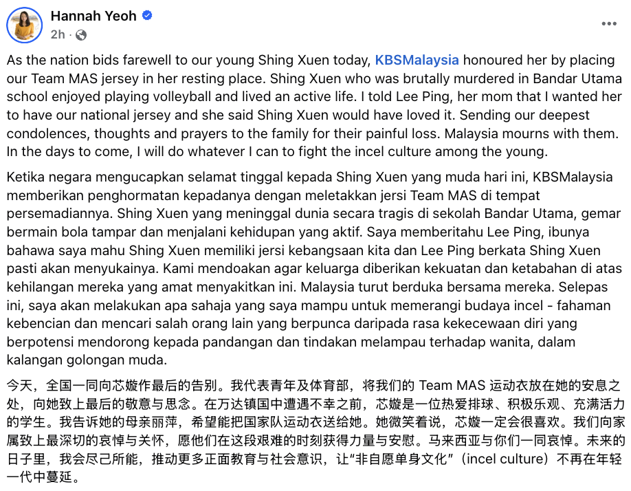 Menteri Belia dan Sukan, Hannah Yeoh menzahirkan penghormatan penuh makna buat mendiang Yap Shing Xuen apabila beliau meletakkan jersi Pasukan MAS di tempat persemadian remaja berusia 16 tahun itu.