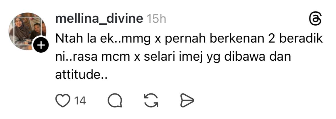 “Entah lah ek, memang tak pernah berkenan dua beradik ni, rasa macam tak selari imej yang dibawa dengan attitude,” tulis wargamaya.