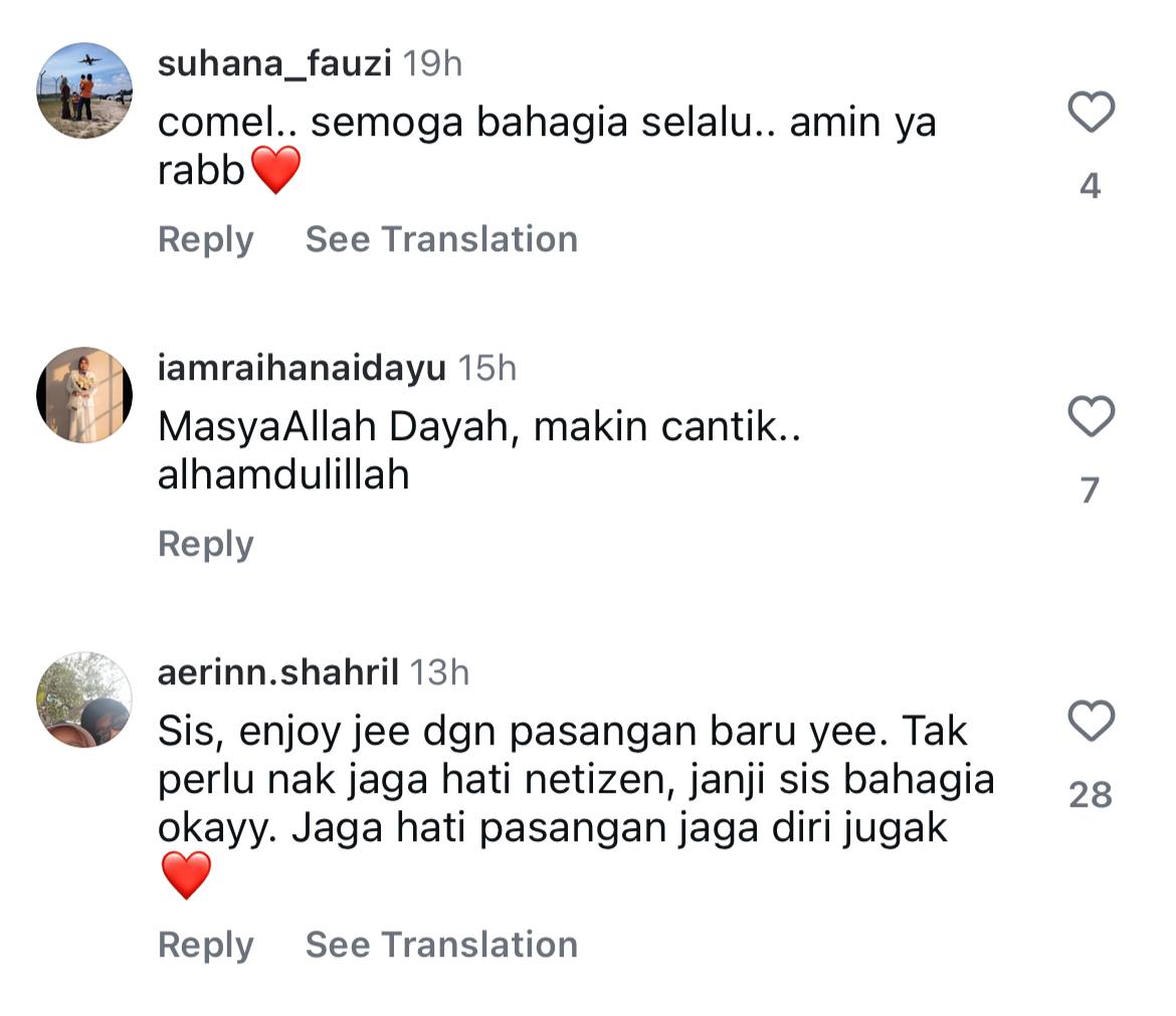 Menjengah ke ruangan komen, warganet mendoakan Hidayah berbahagia dengan kehidupan yang baharu dan ada juga yang mendakwa wajah kekasihnya mirip seperti arwah.