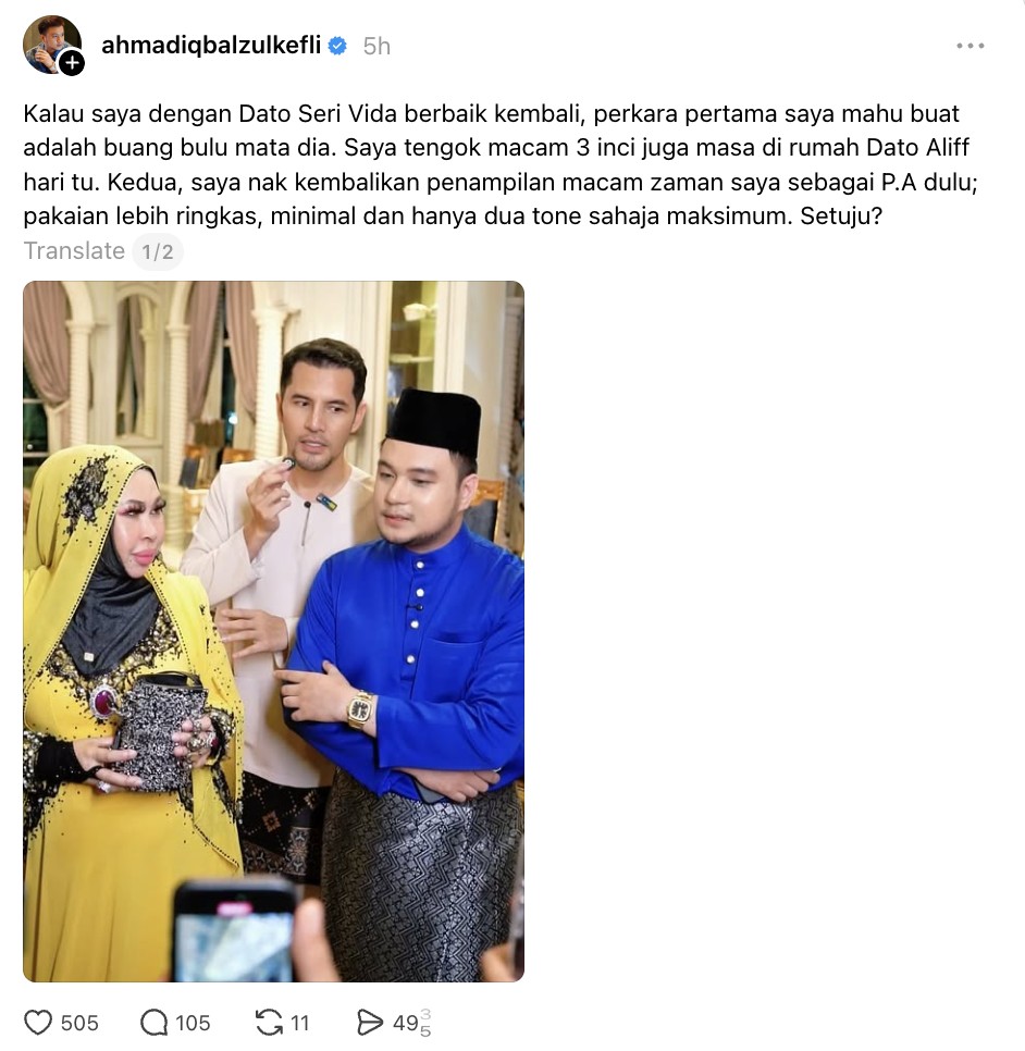 Bekas pembantu peribadi, Dato’ Seri Vida, Ahmad Iqbal Zulkefli menyuarakan hasrat untuk membuang bulu mata yang digayakan usahawan itu jika mereka kembali berbaik.