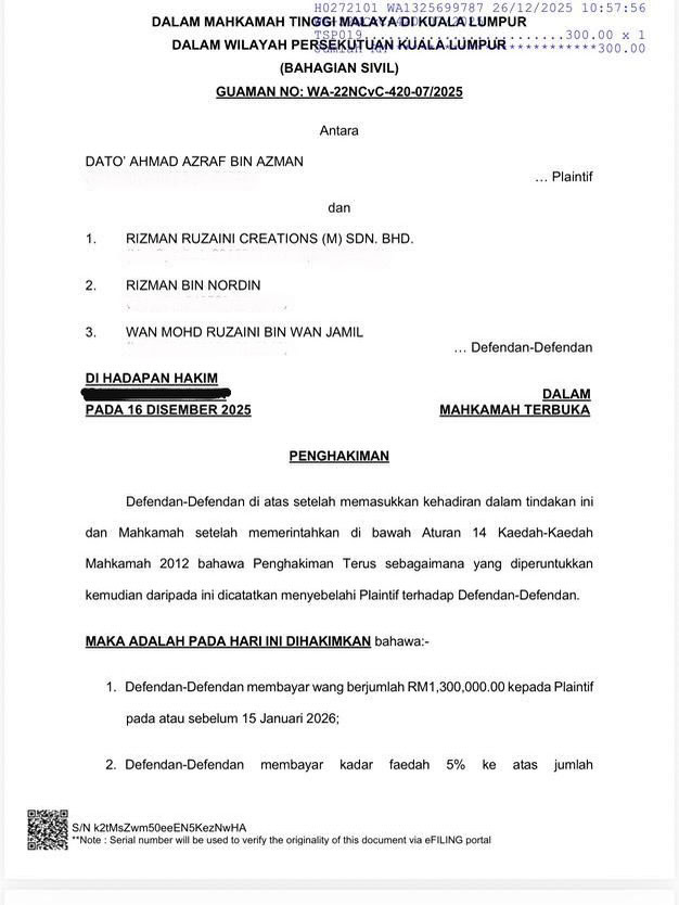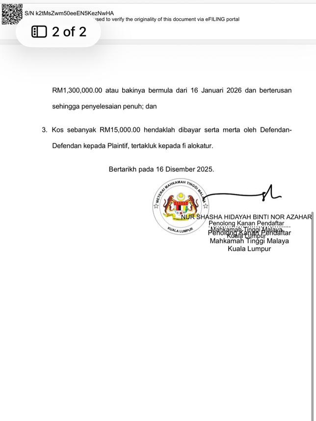 Dalam dokumen mahkamah bertarikh 16 Disember lalu, pihak mahkamah menetapkan jumlah pembayaran RM1.3 juta yang perlu diselesaikan oleh defendan sebelum 15 Januari 2026.