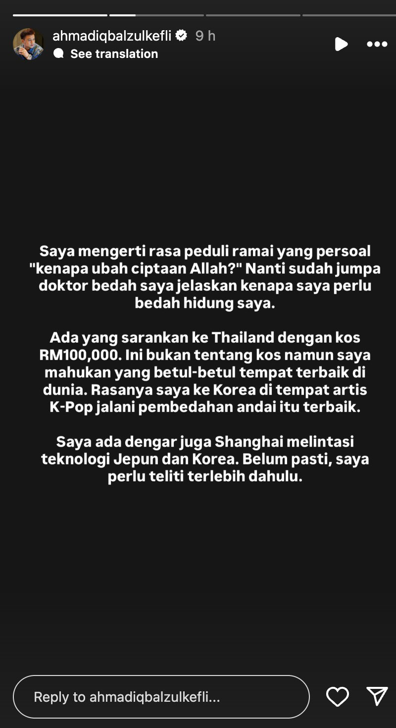 “Saya mengerti rasa peduli ramai yang persoal ‘kenapa ubah ciptaan Allah?’ Nanti sudah jumpa doktor bedah saya jelaskan kenapa saya perlu bedah hidung saya,” jelasnya.