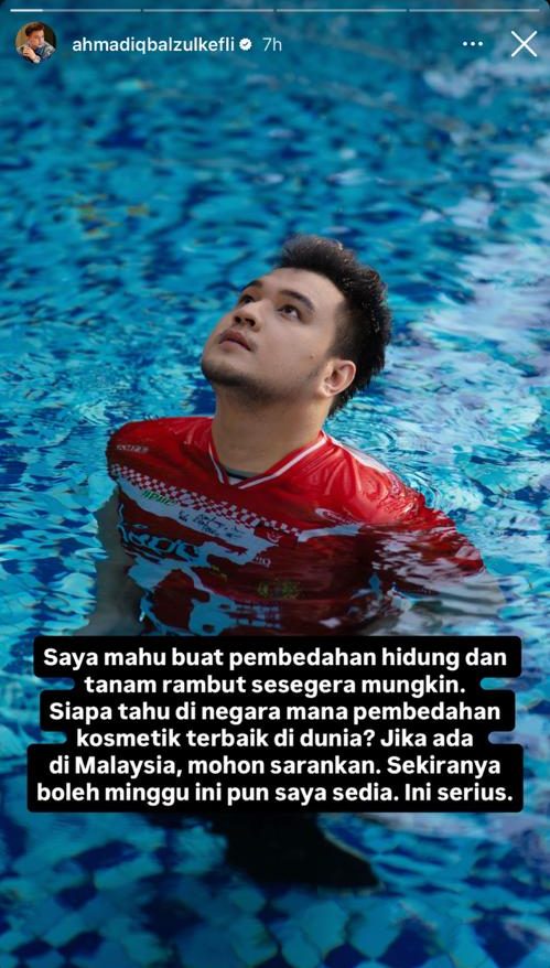 Pempengaruh media sosial dan usahawan, Ahmad Iqbal Zulkefli, 31, mendedahkan hasratnya untuk menjalani dua prosedur kosmetik iaitu pembedahan hidung (rhinoplasty) dan tanam rambut dalam masa terdekat.