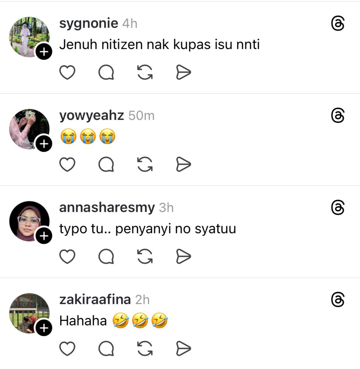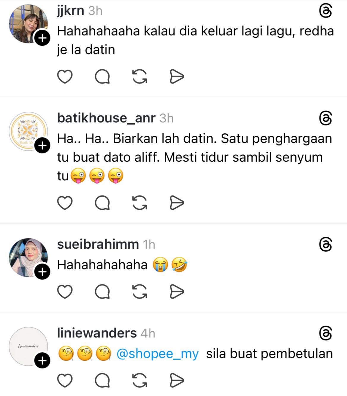 “Saya risau seminggu sekali dia (Aliff Syukri) keluar lagu, harap-harap dapatlah segera ditukar,” ciapan Shahida di Threads.
