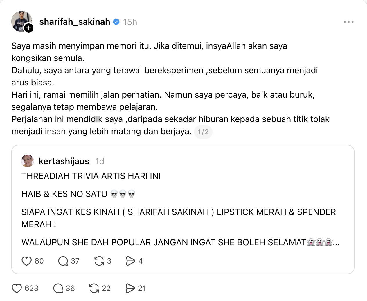 Pelakon Sharifah Sakinah menjadi perhatian apabila memberi respon terhadap seorang individu yang mengungkit semula kisah silamnya di media sosial.