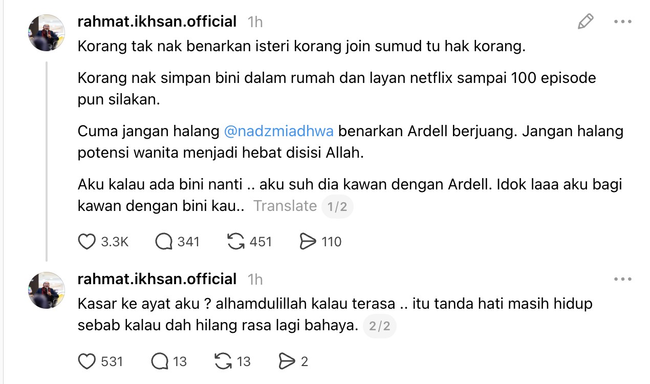“Anda tak nak benarkan isteri anda join Sumud tu hak anda. Nak simpan bini dalam rumah dan layan Netflix sampai 100 episod pun silakan. Cuma jangan halang Nadzmi benarkan Ardell berjuang,” ciapannya, hari ini.