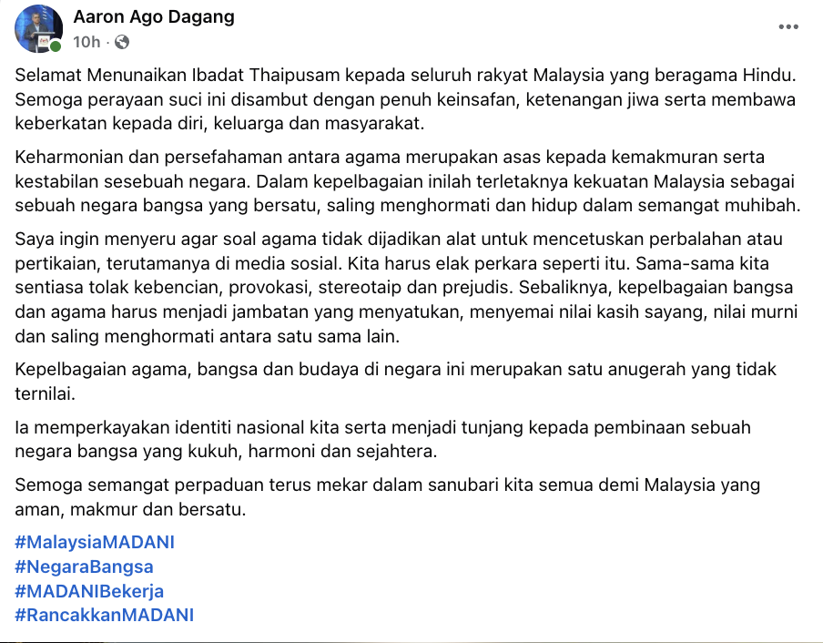 Menerusi hantaran itu juga, beliau mengucapkan selamat menyambut Thaipusam kepada seluruh penganut Hindu dan berharap perayaan itu membawa keberkatan kepada diri, keluarga dan masyarakat.