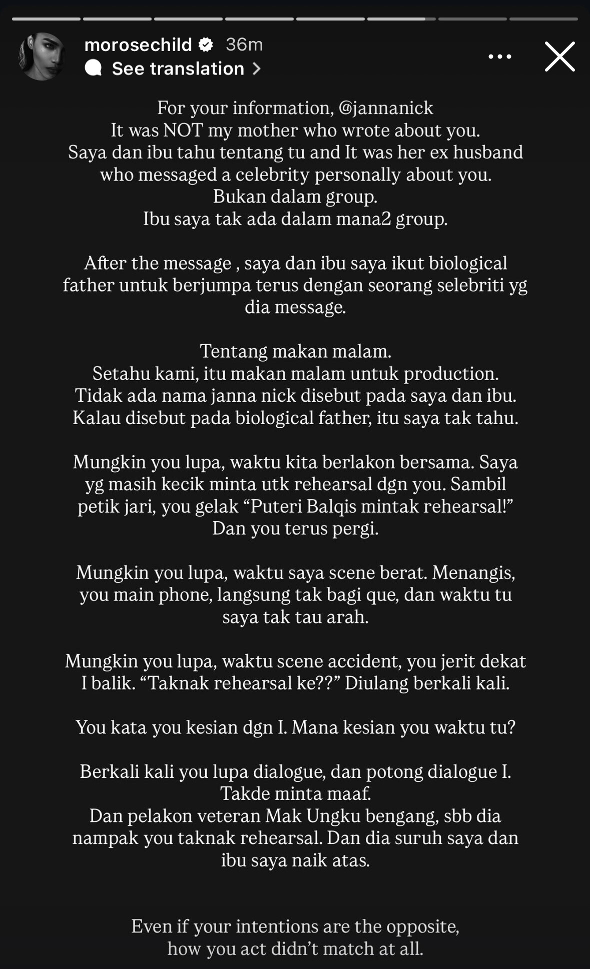 Namun begitu, Janna tetap memuji bakat dan dedikasi Puteri Balqis sejak kecil, sambil menegaskan tidak menyimpan dendam meskipun tercetus perselisihan faham antara mereka.