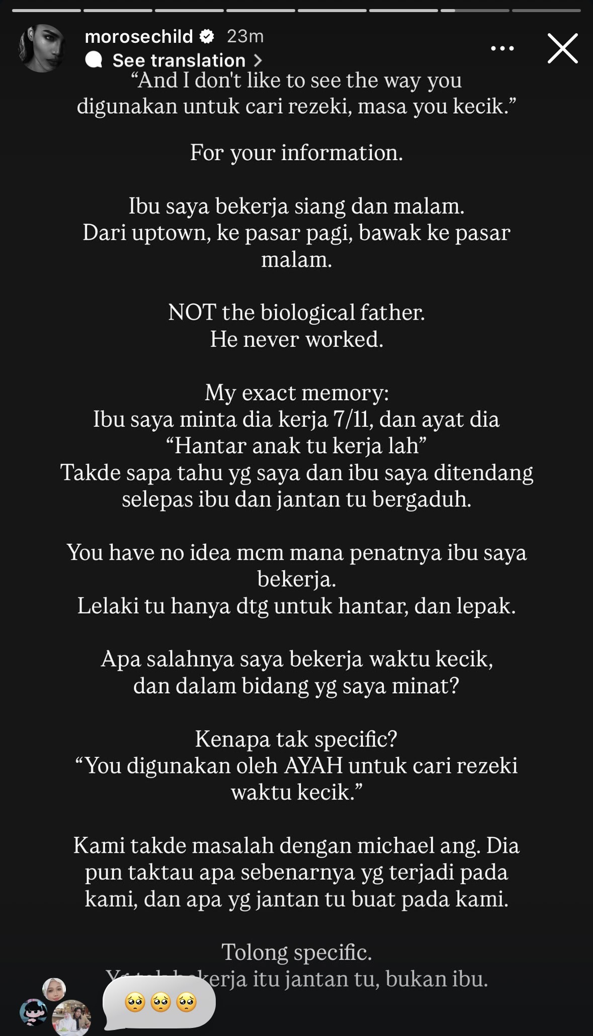 Mengimbas kenangan lama, pelakon filem Kimchi Untuk Awak itu mengakui pernah berasa sedih melihat Aqish bekerja pada usia terlalu muda dan mendakwa dirinya pernah dipulaukan rakan selebriti selama beberapa tahun akibat salah faham melibatkan ibu pelakon remaja tersebut.