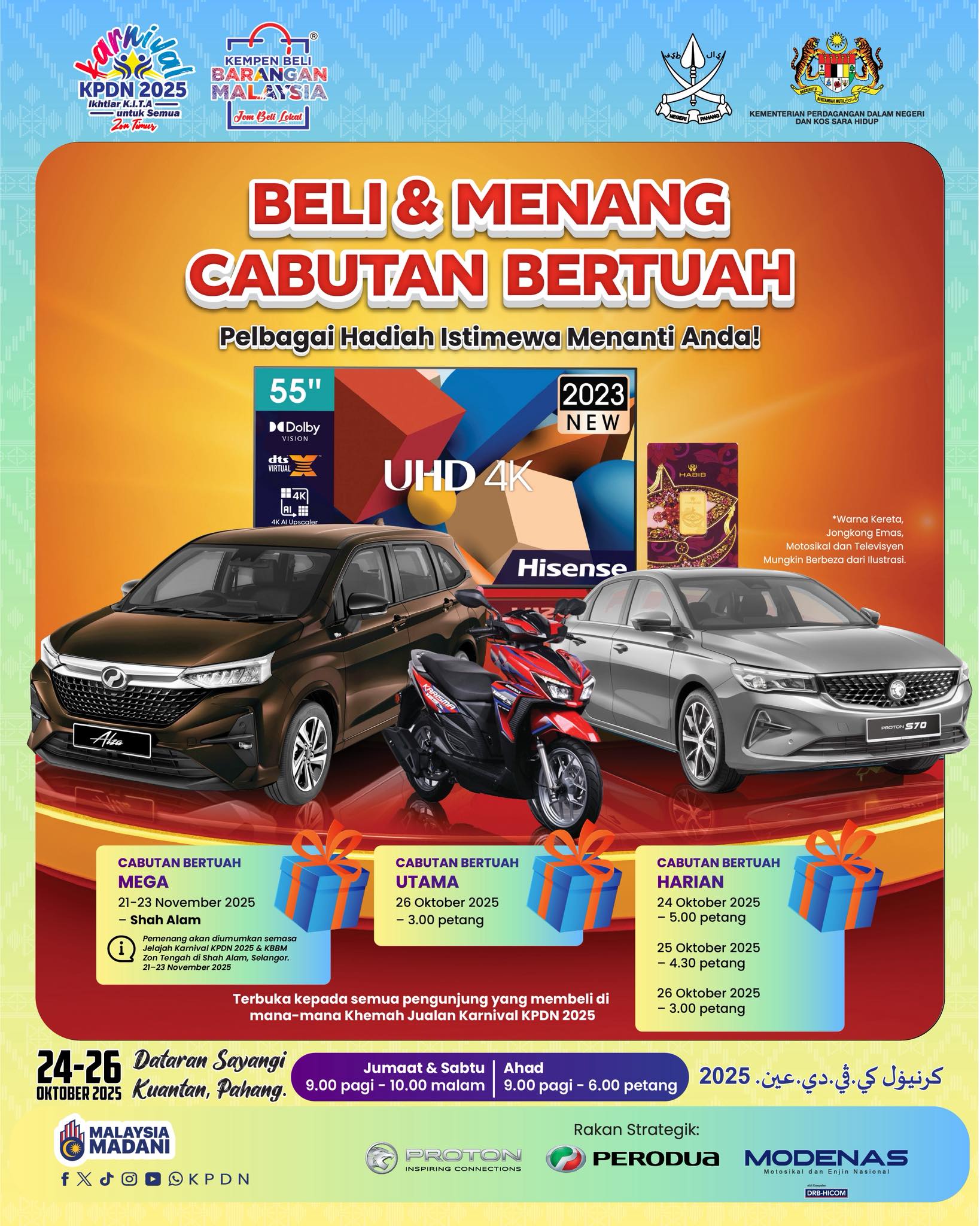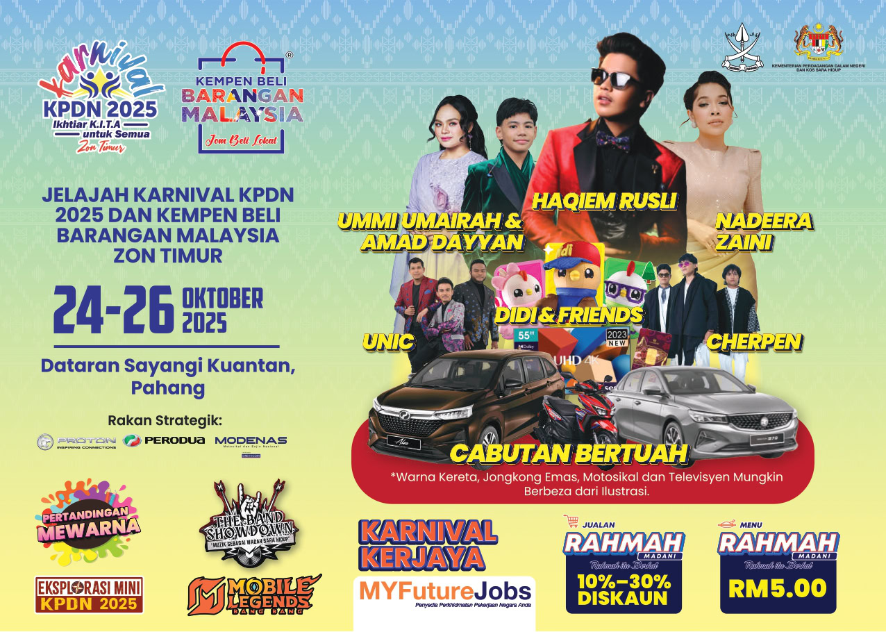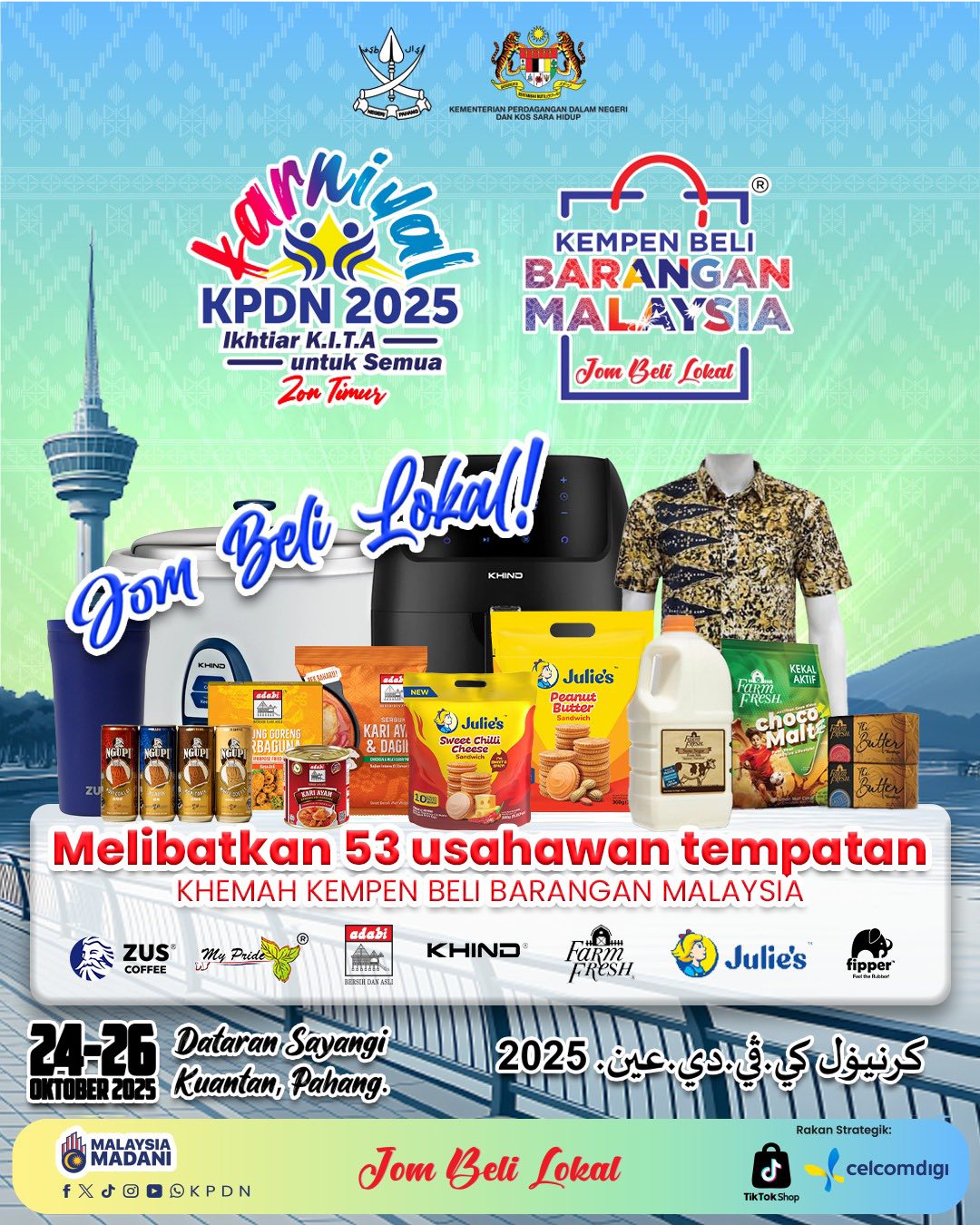 Jelajah Karnival Kementerian Perdagangan Dalam Negeri dan Kos Sara Hidup (KPDN) 2025 dan Kempen Beli Barangan Malaysia (KBBM) Zon Timur diteruskan di Pahang, dengan penganjuran di Dataran Sayangi Kuantan bermula 24 hingga 26 Oktober ini.