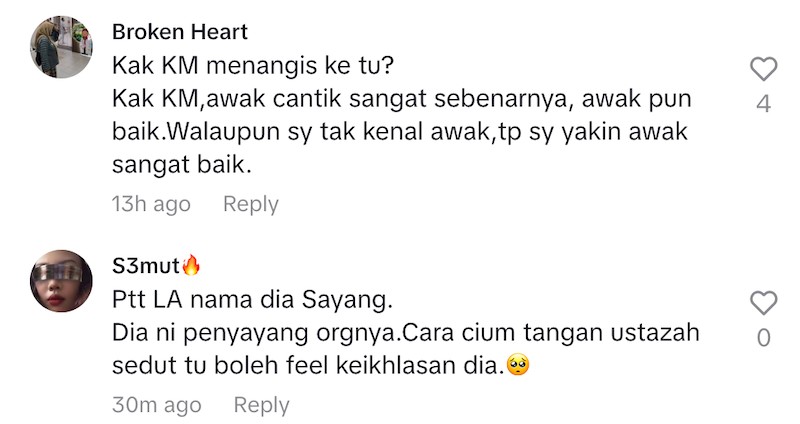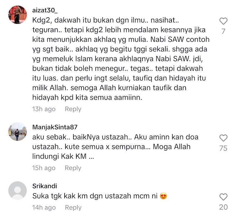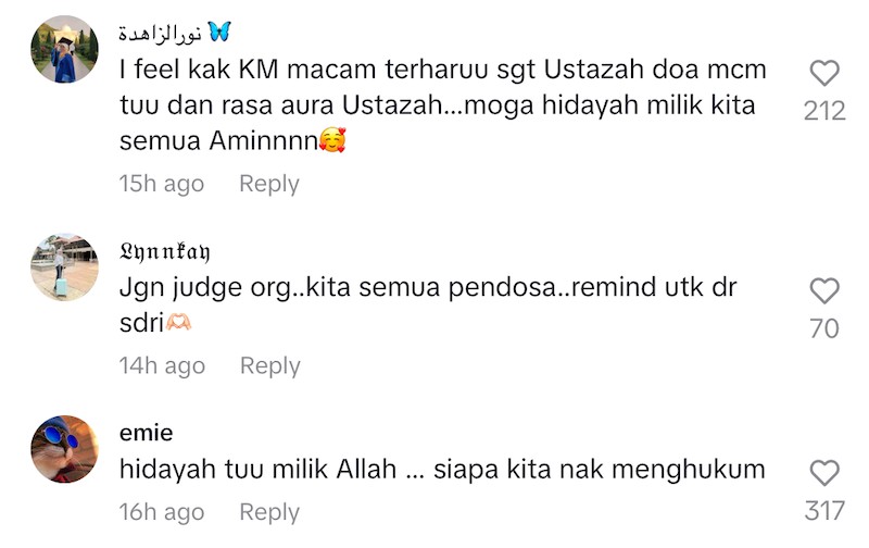 “Saya tahu Kak KM orangnya baik dalam dan luar insya-Allah. Jaga diri ya,” ujar Ustazah Asma.
