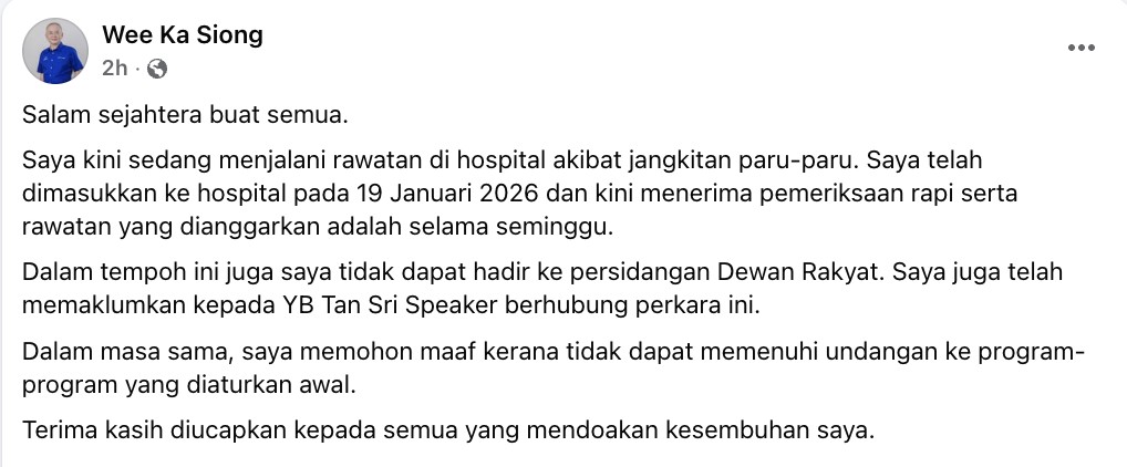 Presiden MCA, Datuk Seri Dr. Wee Ka Siong dilaporkan dimasukkan ke hospital sejak 19 Januari lalu berikutan jangkitan kuman pada paru-paru.