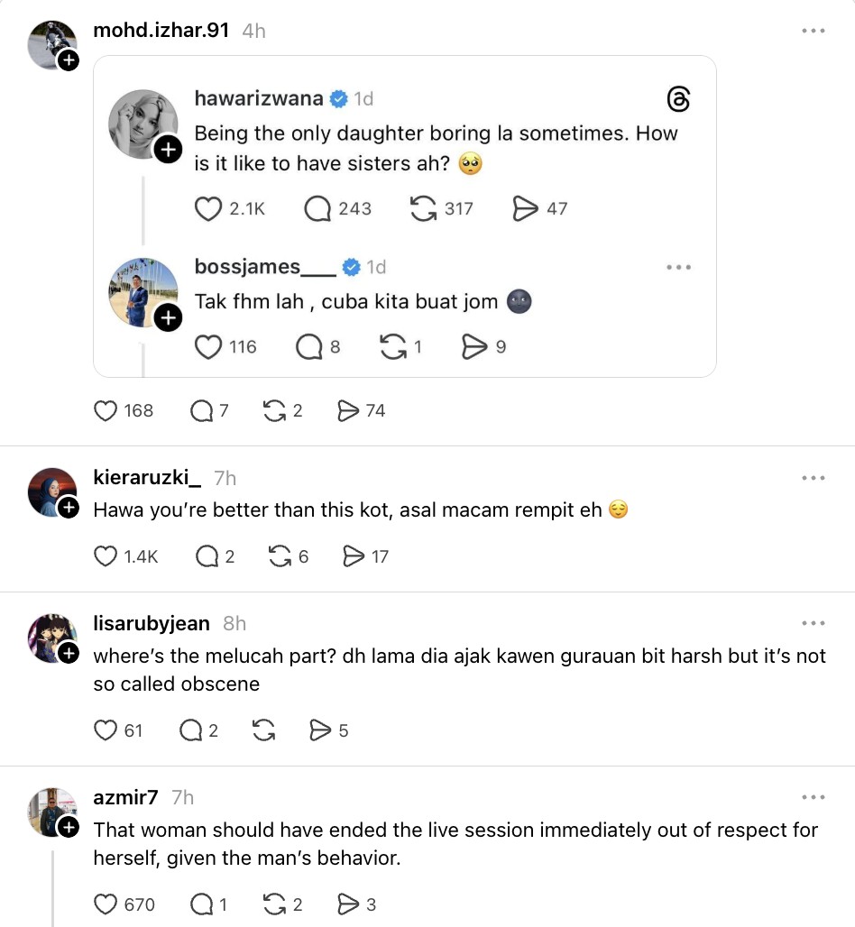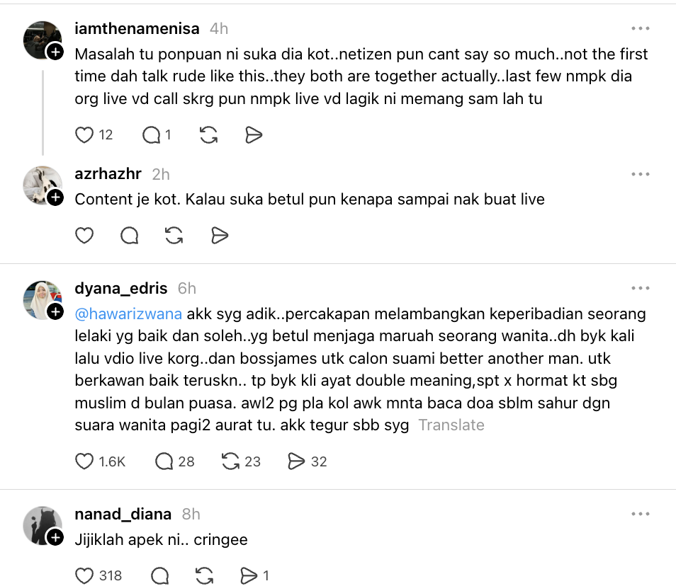 Pengacara Hawa Rizwana dan usahawan, Boss James menarik perhatian netizen selepas tular klip siaran langsung mereka di TikTok baru-baru ini.