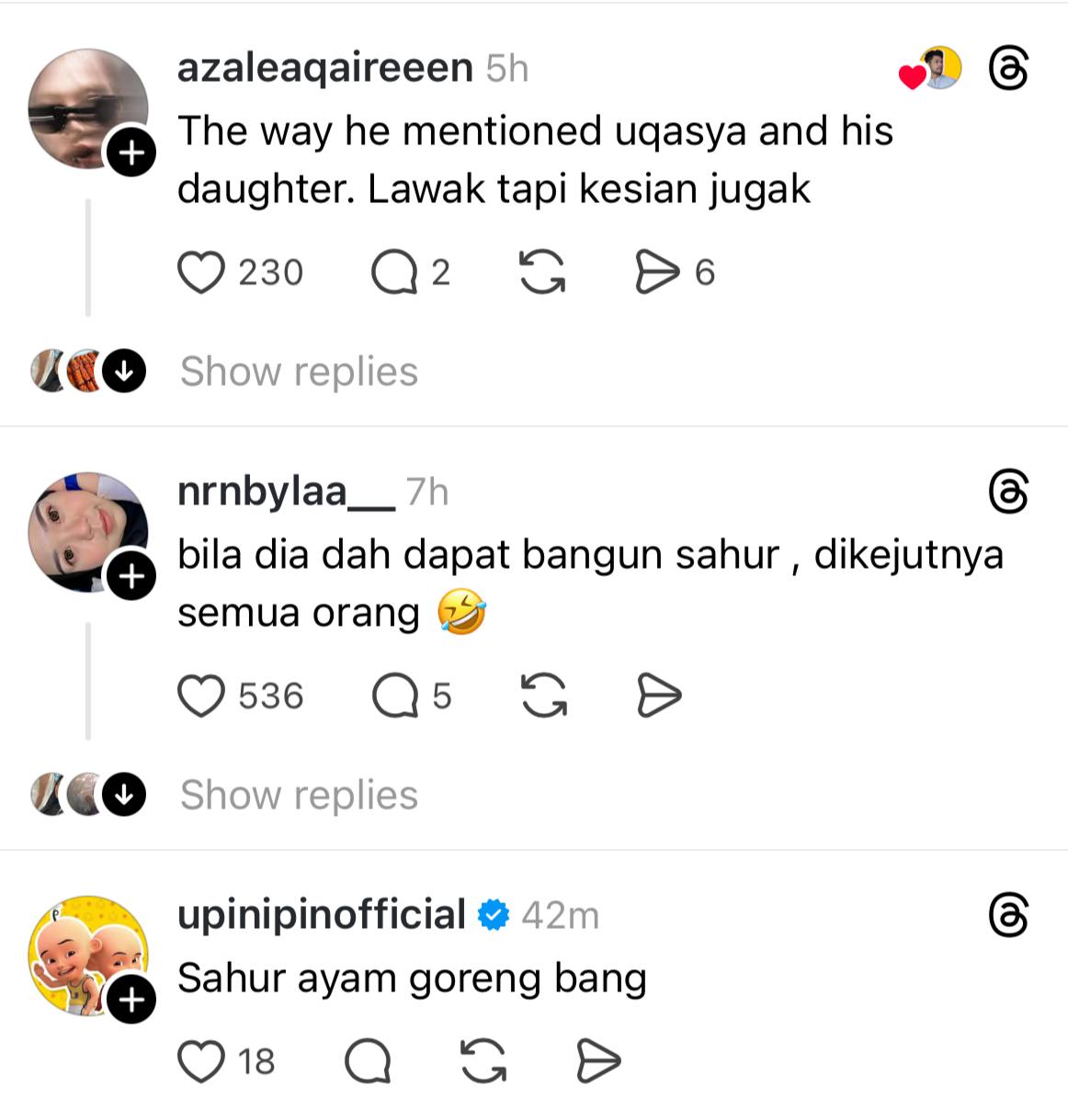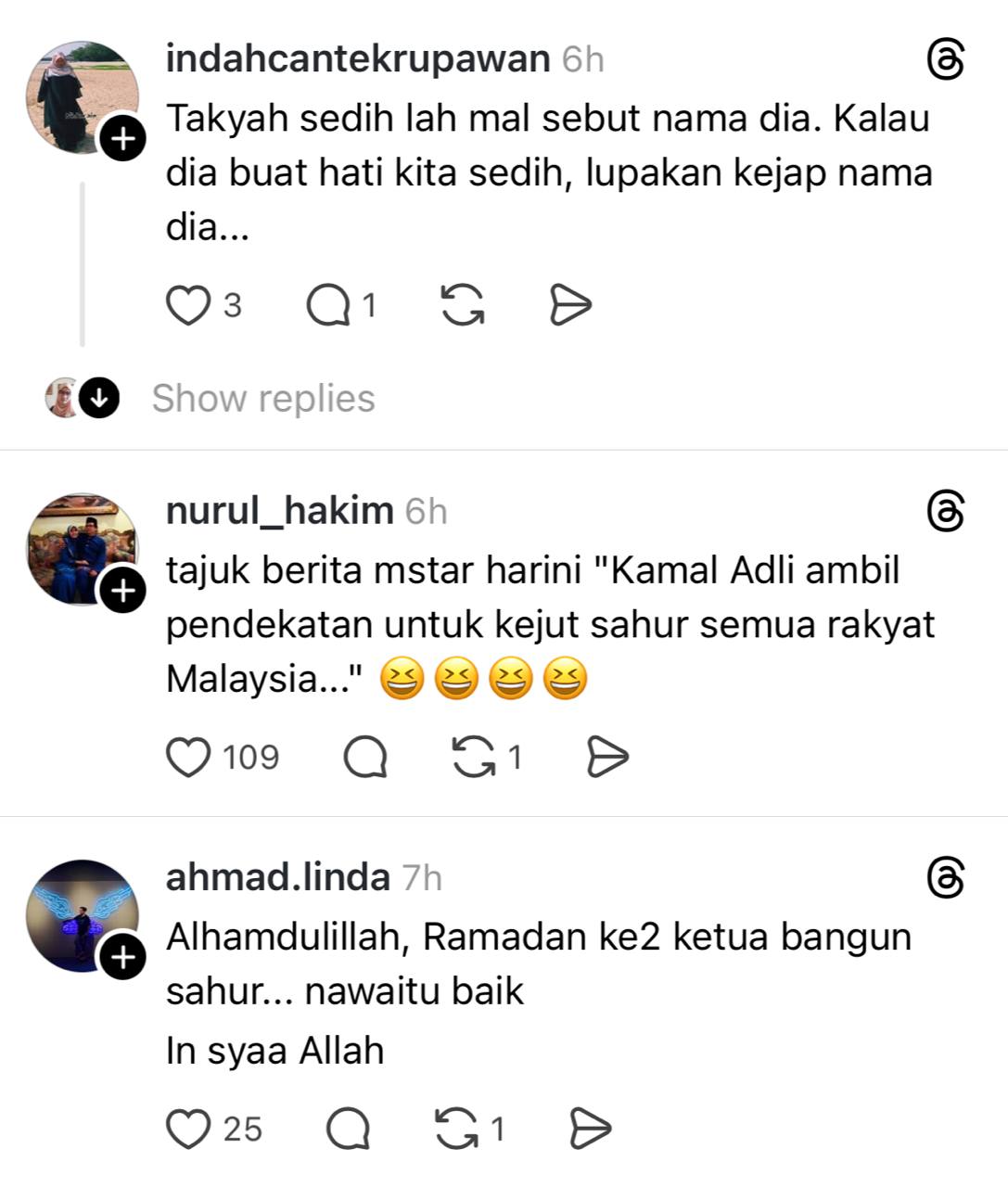 “Bangun sahur, tak kisahlah kepada semua rakyat yang ada dalam Threads. Saya kejut ini, semua bangun.