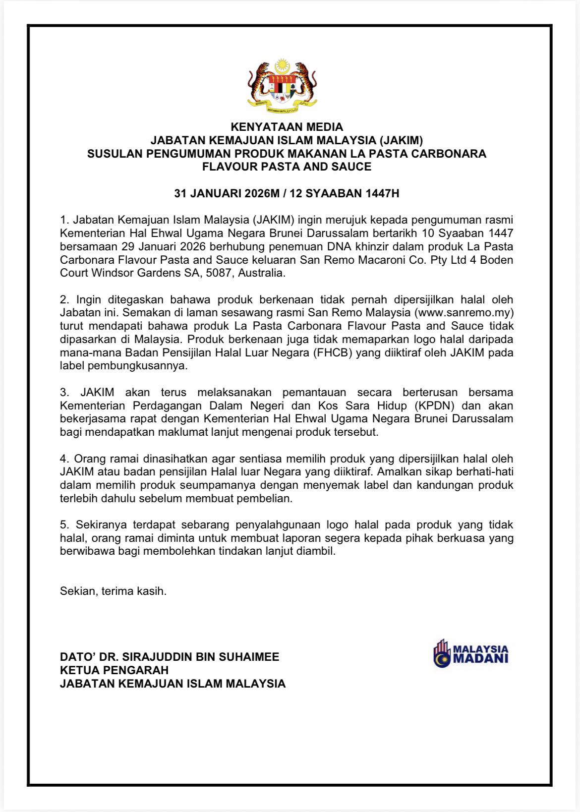 Ketua Pengarah JAKIM, Datuk Dr Sirajuddin Suhaimee menegaskan bahawa produk pasta berkenaan tidak pernah dipersijilkan halal oleh JAKIM.