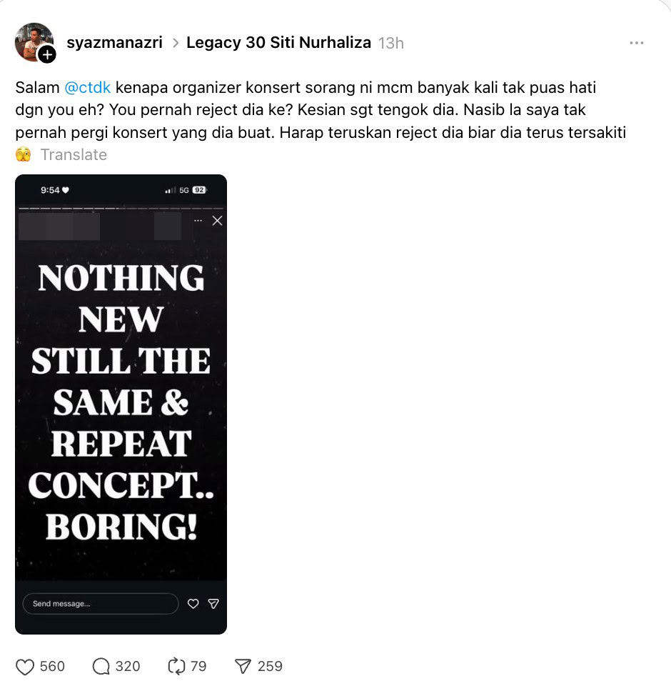 “Nothing new, still the same and repeat concept. Boring,” tulisnya, yang dipercayai merujuk kepada Konsert Legacy 30 Siti Nurhaliza.