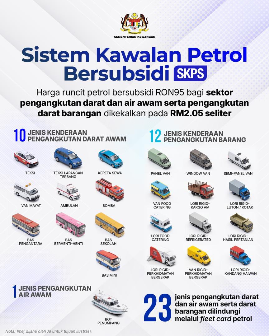 Kementerian Kewangan (MoF) berkata, langkah itu dilaksanakan melalui Sistem Kawalan Petrol Bersubsidi (SKPS) dan Sistem Kawalan Diesel Bersubsidi (SKDS) yang menyediakan subsidi bahan api bagi sektor pengangkutan darat dan air awam serta pengangkutan barangan tertentu.