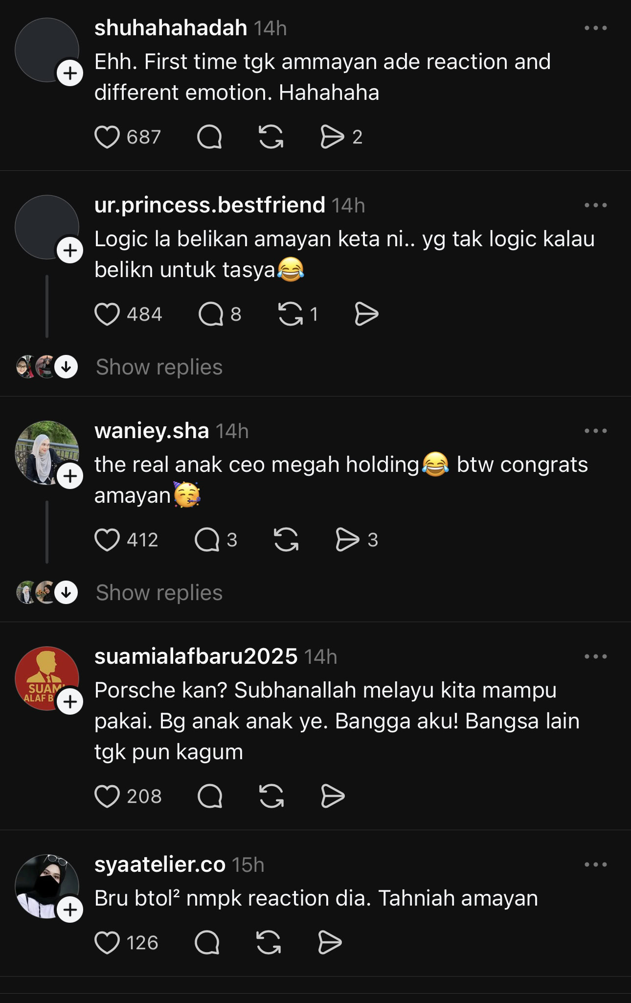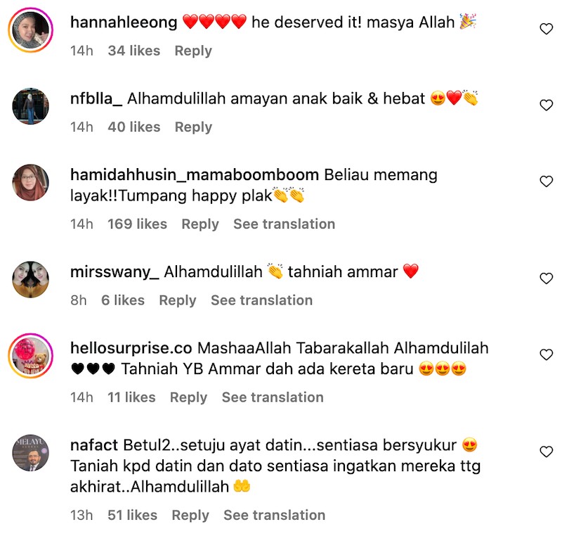 Menjengah ke ruangan komen, rata-rata netizen menzahirkan ucapan tahniah kepada Ammar dan berpandangan layak menerima hadiah tersebut kerana banyak membantu keluarganya menguruskan perniagaan.