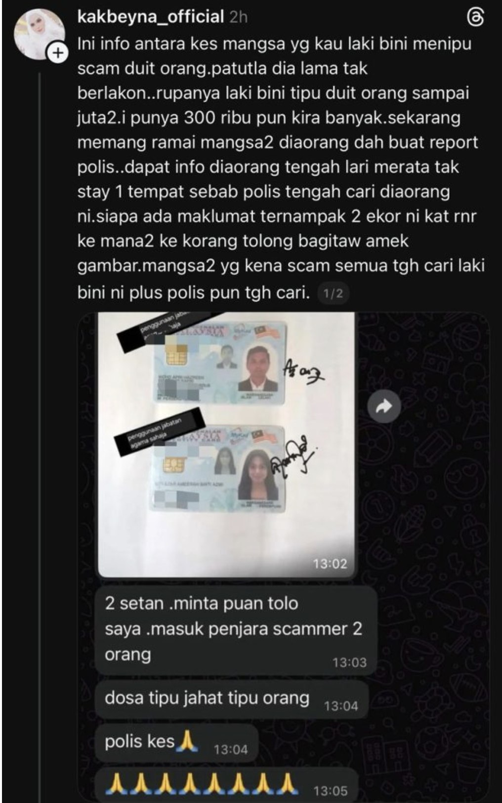 Mangsa turut memuat naik bukti tangkap layar kad pengenalan pasangan berkenaan serta memohon bantuan orang ramai untuk menjejaki mereka.