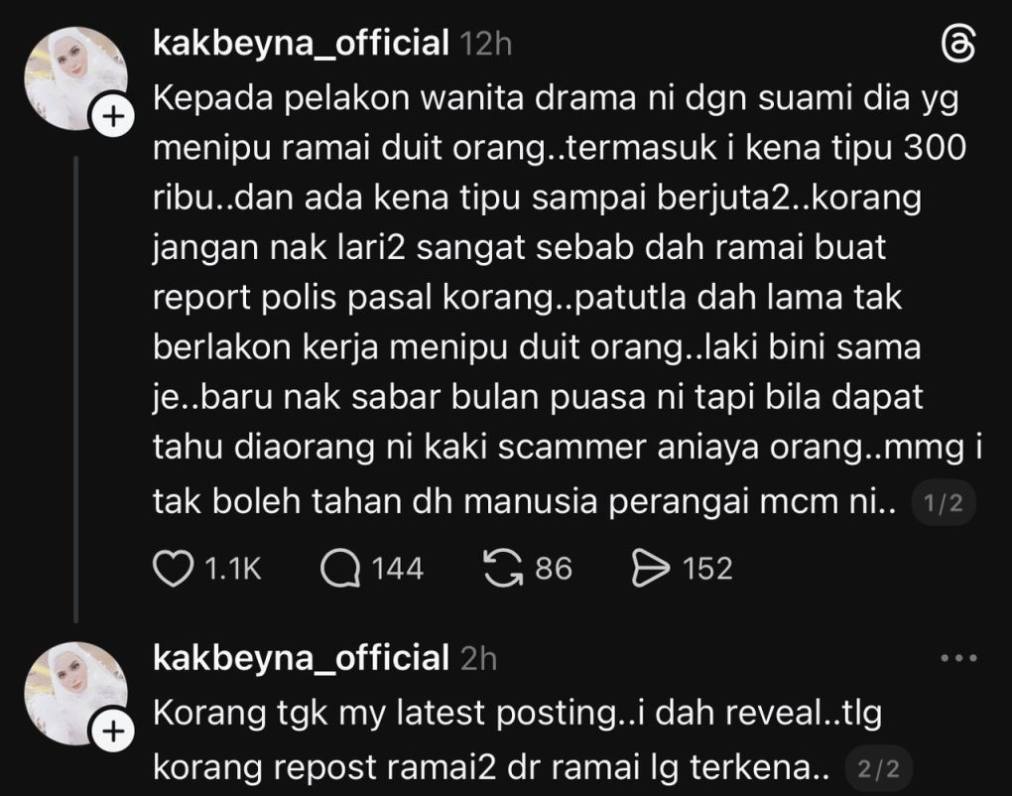 Sebelum ini, sebuah portal melaporkan seorang individu mendakwa dirinya telah ditipu sebanyak RM300,000 oleh pelakon wanita dan suaminya melalui platform Threads.