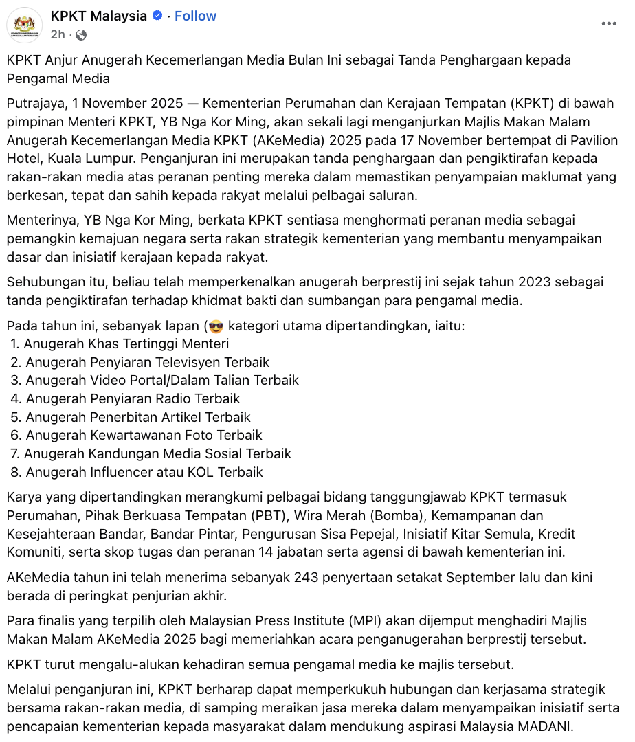 Kementerian Perumahan dan Kerajaan Tempatan (KPKT) akan menganjurkan Majlis Makan Malam Anugerah Kecemerlangan Media (AKeMedia) 2025 pada 17 November ini.