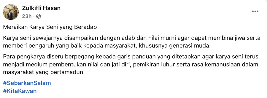 Dr Zulkifli berharap teguran ini diterima dengan hati terbuka demi kebaikan bersama, merujuk kepada lagu baharu seorang artis wanita tempatan yang dikatakan mengandungi lirik lucah sehingga mengundang reaksi kurang senang warganet.