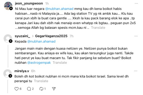 Dalam masa yang sama, akaun Instagram Nubhan turut dibanjiri komen kecaman daripada orang ramai yang mendesak agar penyanyi itu tampil memberikan penjelasan berhubung isu berkenaan.