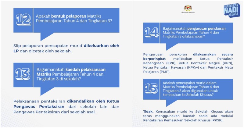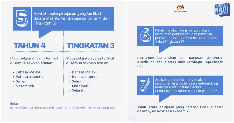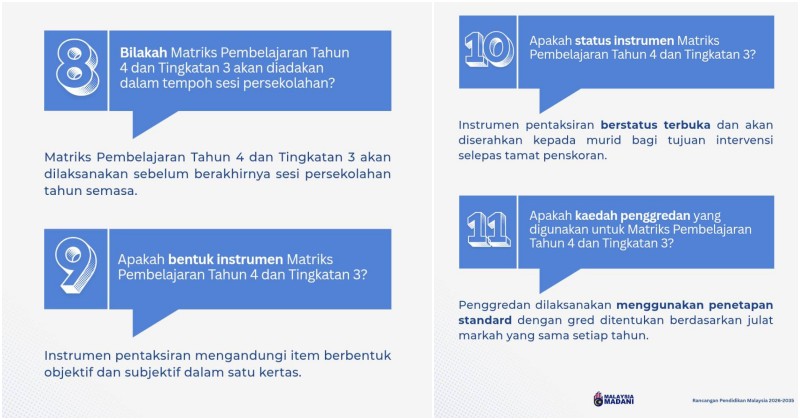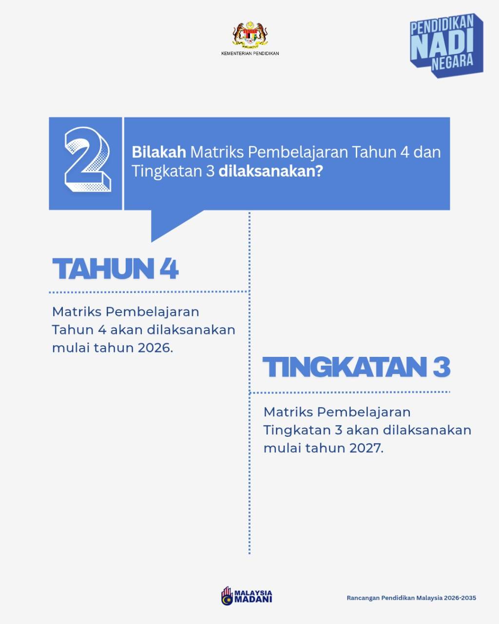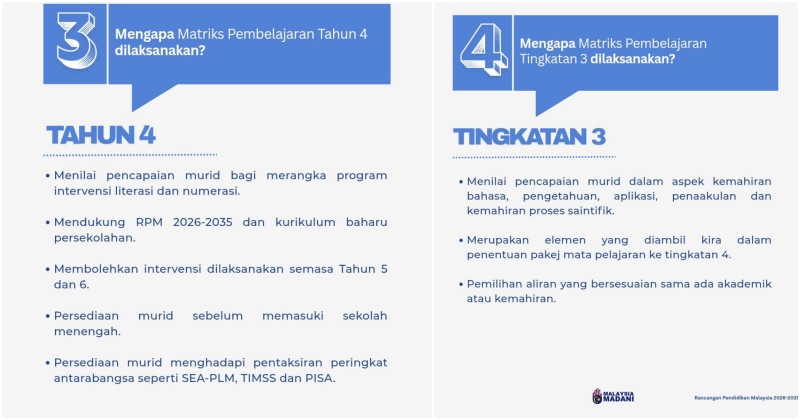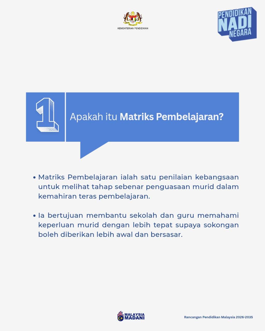 Menteri Pendidikan, Fadhlina Sidek, berkata Matriks Pembelajaran tahun empat menumpukan kepada literasi, numerasi dan kemahiran asas saintifik, manakala Matriks Pembelajaran tingkatan tiga menilai kemahiran bahasa, pengetahuan, aplikasi, penaakulan serta kemahiran proses saintifik.