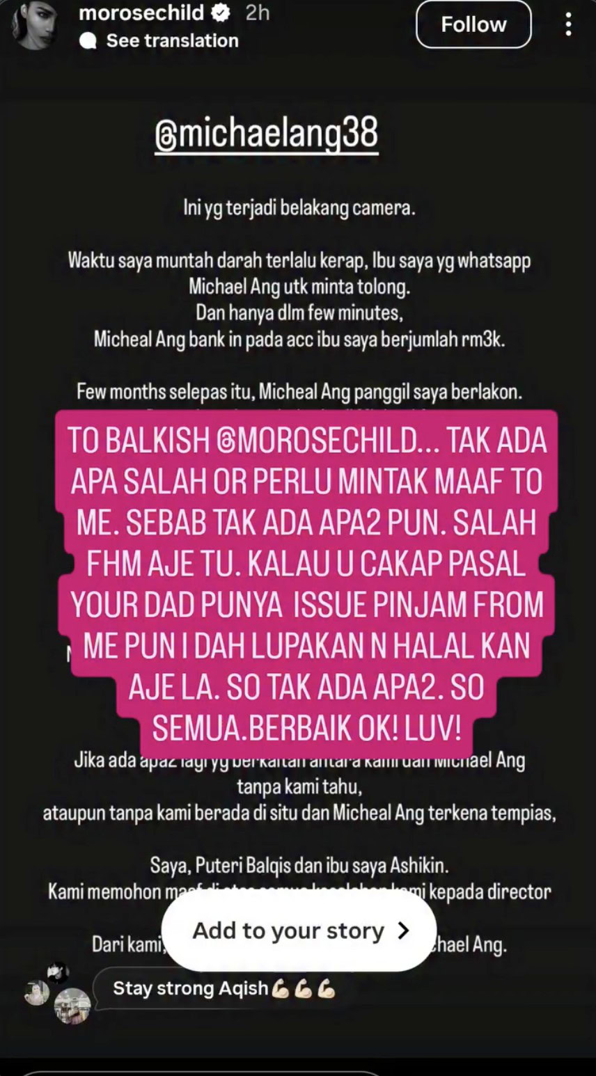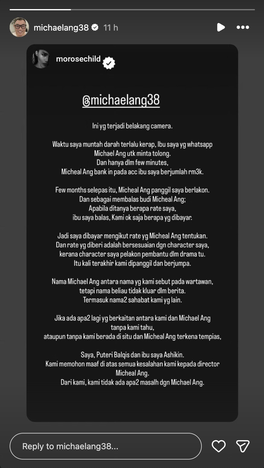 Pengarah dan penerbit, Michael Ang, menegaskan tiada keperluan bagi pelakon Puteri Balqis untuk memohon maaf kerana beliau tidak pernah melakukan sebarang kesalahan terhadapnya.