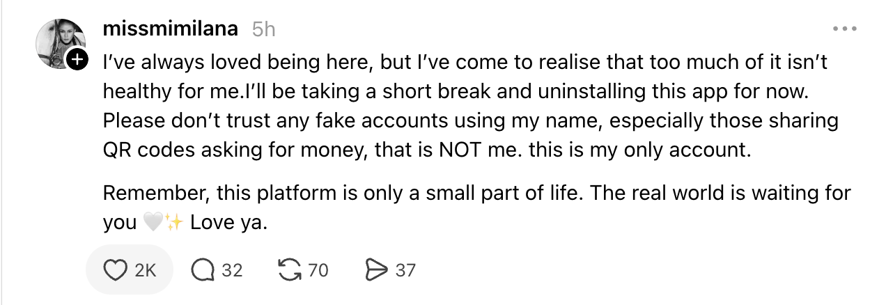 Menerusi hantaran di Threads, Mimi atau nama sebenarnya, Mimi Roziana Zainal Abidin, 31, berkata keputusan itu dibuat kerana tidak mahu penggunaan platform berkenaan memberi impak negatif sehingga menjejaskan kesihatannya.
