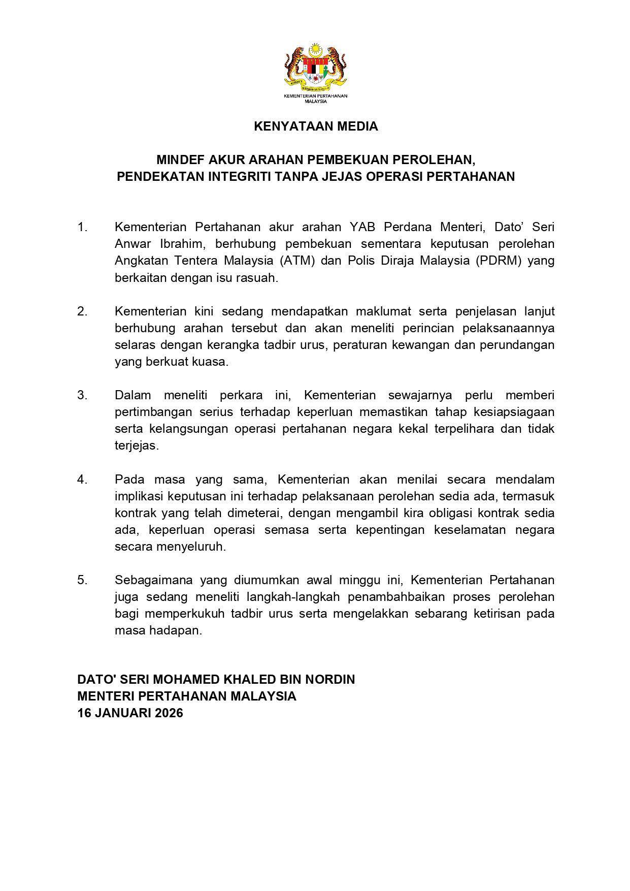 Kementerian Pertahanan (MINDEF) mengesahkan akur terhadap arahan Perdana Menteri, Dato’ Seri Anwar Ibrahim, berhubung pembekuan sementara semua keputusan perolehan Angkatan Tentera Malaysia (ATM) dan Polis Diraja Malaysia (PDRM) yang berkaitan isu rasuah.