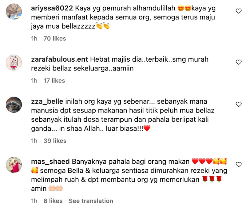 Dalam pada itu, ramai mendoakan agar rezeki Bellaz dan sekeluarga dimewahkan selalu dan tidak pernah berhenti untuk berbakti serta membantu orang yang memerlukan.