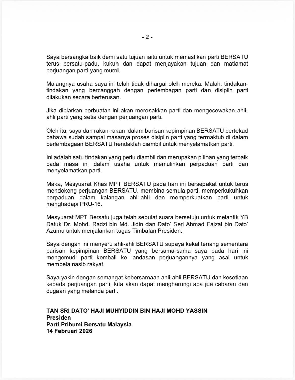 “Saya menyeru seluruh ahli BERSATU supaya kekal tenang dan terus memberi kepercayaan kepada barisan kepimpinan yang ada untuk mengemudi parti kembali ke landasan perjuangan asalnya dalam membela nasib rakyat.