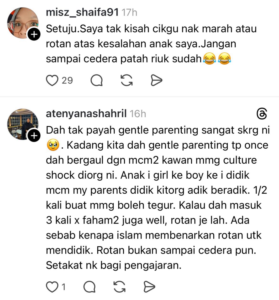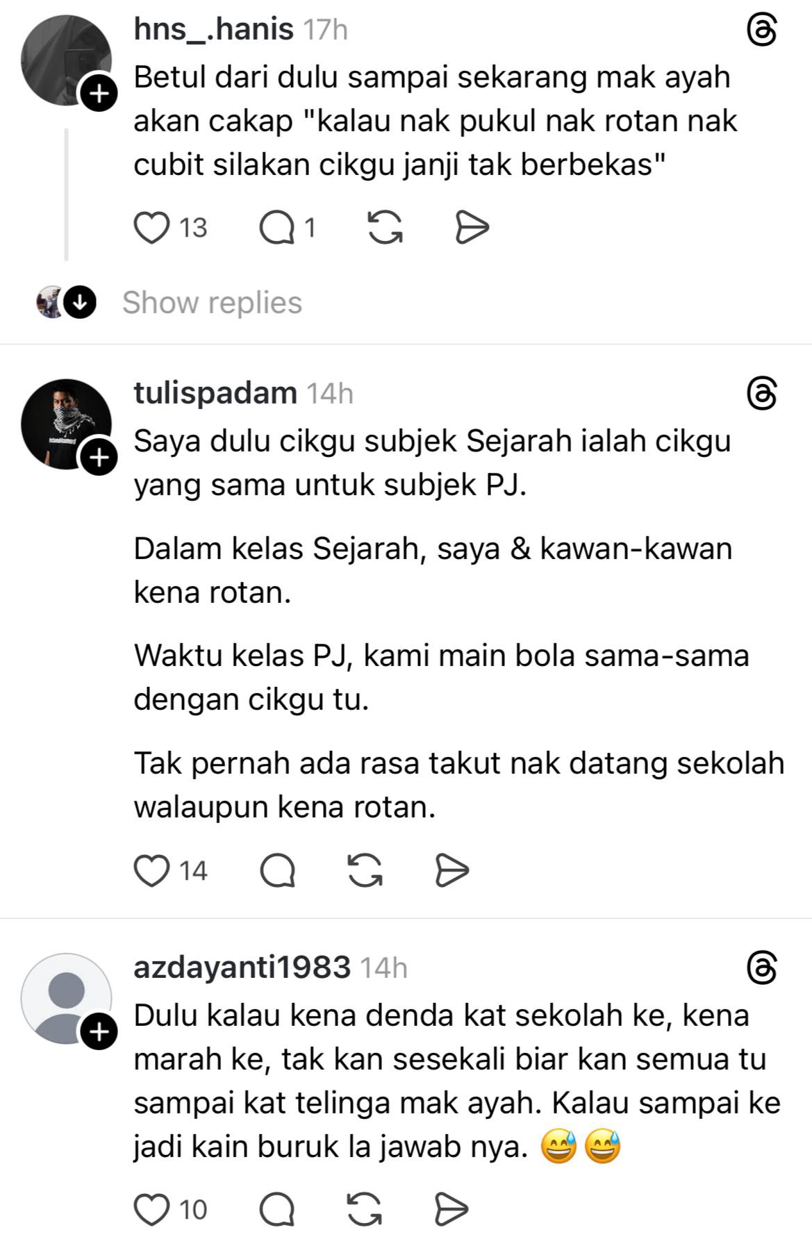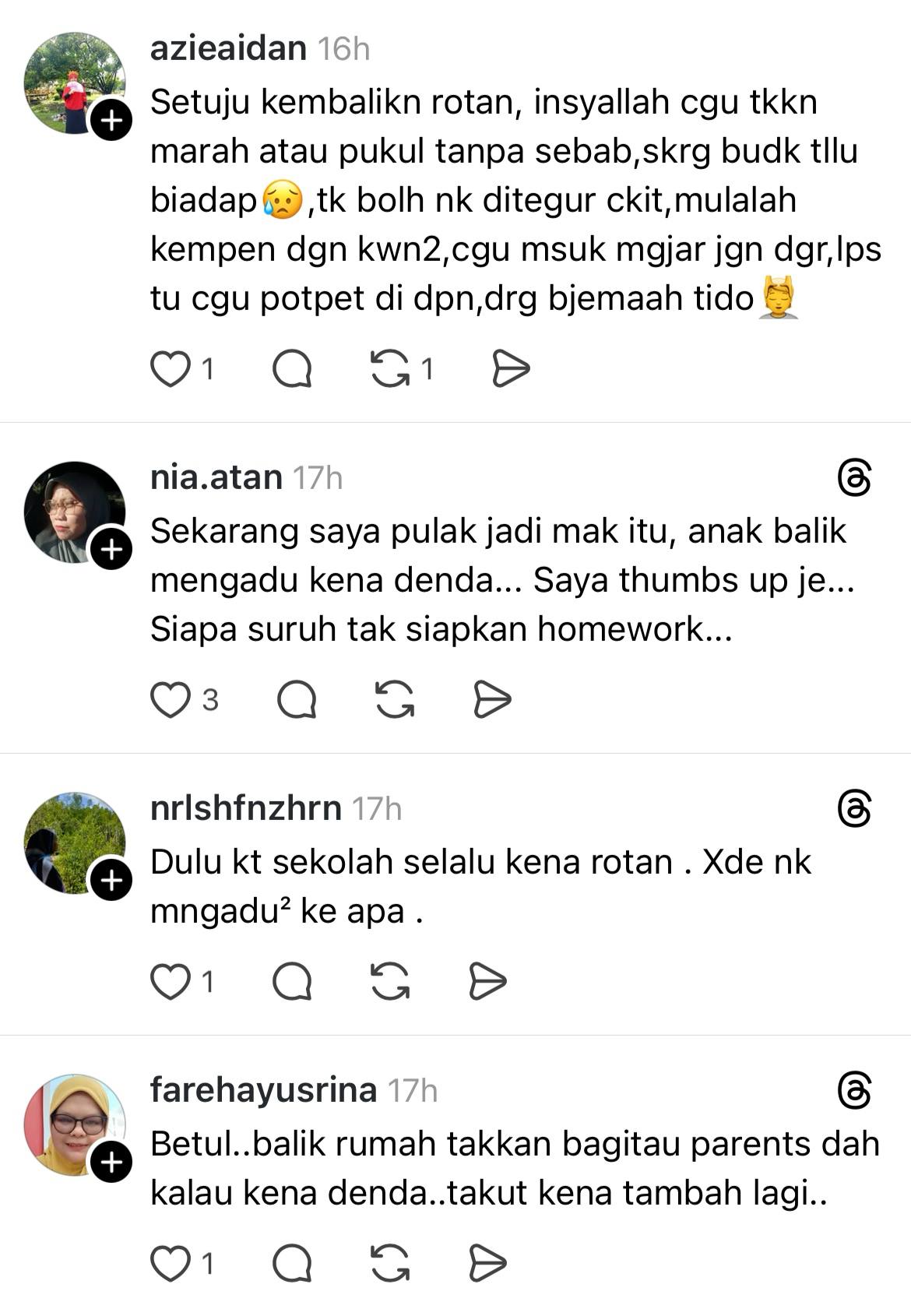 “Kalau salah tu tetap salah! Siapa je tak pernah kena rotan? Tarik rambut tepi telinga? Cubit? Itu membuatkan kita jadi manusia berguna di masa depan. Kembalikan Rotan,” ciapan Nadzmi di Threads.